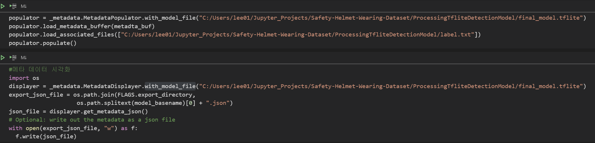 위 코드를 사용하면 필요한 메타 데이터를 추가 할 수 있다. 코드를 보면 아래의 부분을 볼 수 있는데 여기에 자신이 메타데이터를 추가할 tflite 파일과 label.txt의 경로를 지정한 후 그대로 실행시켜주면 된다.