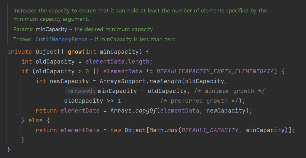 ArrayList는 Array를 사용하며 만약 사용하던 Array의 capacity(용량)가 부족해지면 적절한 크기로 늘린 새로운 Array를 만들고 기존의 데이터를 복사한다. 다른 블로그에서는 대부분 2배로 Array를 늘린다고 되어 있지만, 실제로는 아래와 같이 ArraysSupport.newLength을 사용하여 최적화된 크기로 늘린다.
