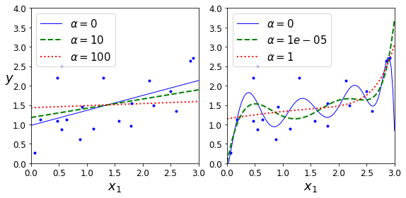 들어가며 지난글에서는 학습곡선을 통해서 모델 학습이 과대적합인지 과소적합인지 파악하여 모델을 결정하는방법에 대해서 알아보았습니다. 과소적합인 경우에는 더 좋은 모델과 하이퍼파라미터를 선택하면되지만 과대적합인 경우에는 어떻게 해결해야할까요? 이번 글에서는 비용함수에 변수를 추가하여 모델을 규제하여 과대적합을 방지하는 방법에 대해서 알아보겠습니다. 목차 1. 과대적합 발생이유 2. 과대적합 해소방법 1.릿지 회귀(티호노프 규제) 2.라쏘 회귀(Lasso Regression) 3.엘라스틱넷 4.조기종료 3.1 과대적합 발생이유 과대적합이 발생하는 이유는 각 파라미터 변수들의 절댓값이 크게 설정되기 때문입니다. 아래 그림은 이후에 설명할 규제의 정도에 따른 학습결과인데 미리 이를 예로 설명하겠습니다. 오른쪽 그..